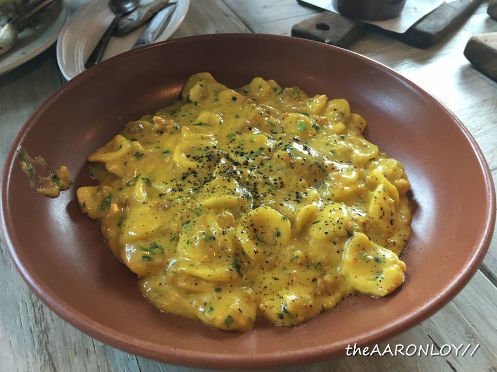 Here’s what I ordered, the Orecchietti with pork sausage and saffron sauce. Sounds good eh? Too bad it looks like a bird that had indigestion delivered it. Or someone’s baby.