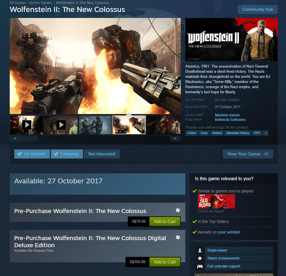 Discount for Wolfenstein 2: The New Colossus in Singapore
